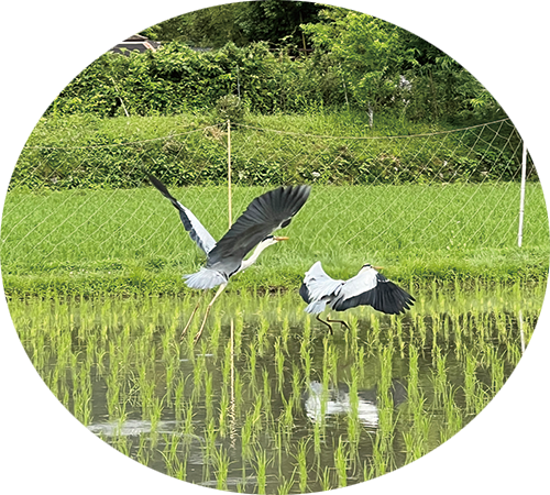 無肥料・農薬不使用で「太陽・土・水」の自然の力でお米を育てています。蛍が舞うきれいな川、生き物が集う京都の里山です。